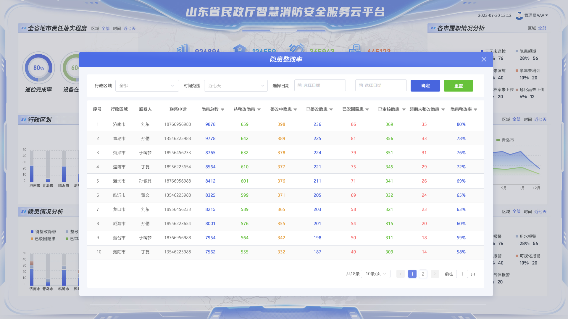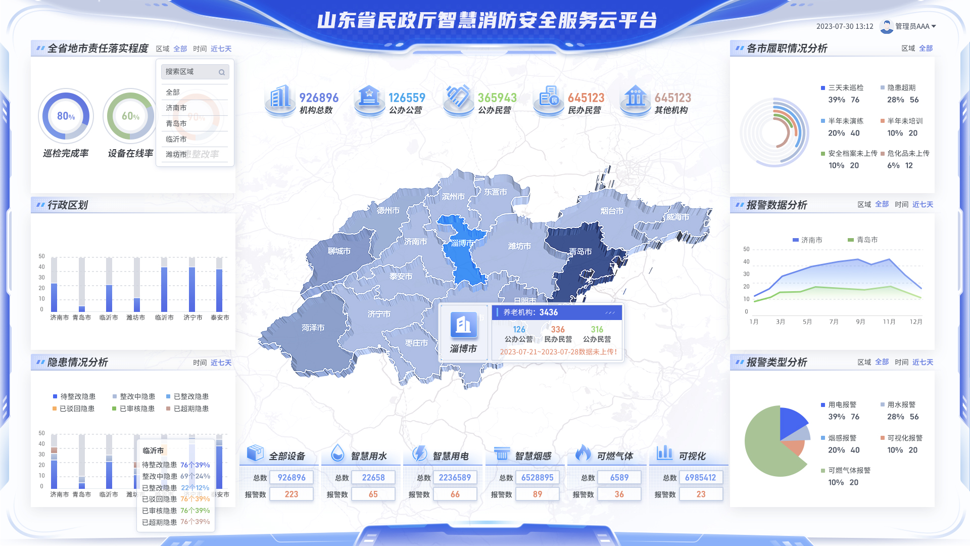 “山東省民政廳智慧消防安全服務云平臺”采取信息化手段來實現對17地市的養老機構的隱患排查進行分流推送、對隱患整改進度進行管控,建立數據庫和物聯網監管平臺,對民政養老進行風險評估、預警,給民政廳和各地市民政局提供抓手進行精準監管,同時系統信息可作為安全隱患排查、整改管理和處罰依據,形成閉環式管理,為政府掌控安全形勢,提供科學依據,從而形成“人防+技防”的立體化防控體系。