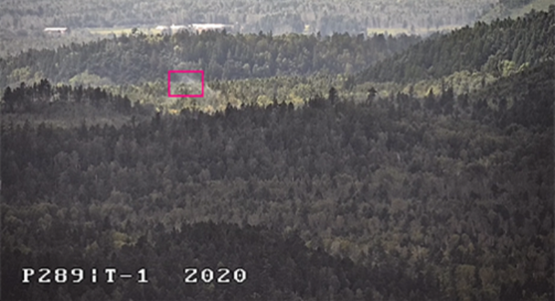 云臺實現了煙火的實時動態檢測,相對后端檢測的形式,提升了檢測效率,發現目標更快速更準確,規避由于遠距離傳輸圖像延時、丟失帶來的漏檢。同時還可設置煙火屏蔽區域以及利用可見光進行火情的清晰確認,利用可見光的同軸定位功能,無偏離同步定位查看細節,同時,可見光可自動調整倍率快速聯動跟蹤,確認火點。實測中,熱成像火點后,可見光立即同步調整與變焦,將火點區域置于畫面中心。