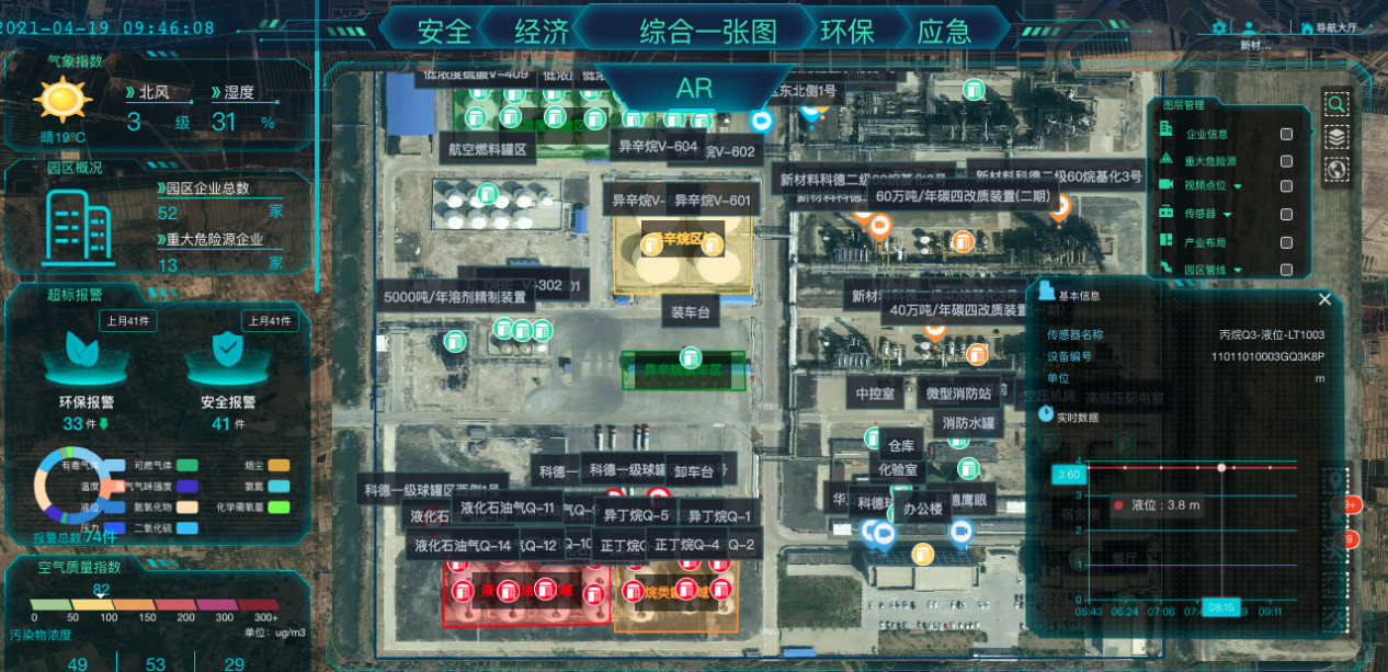 六是綜合防控一張圖,讓隱患無處遁形。“危化品園區監管子系統”可通過“一張圖”隨時查看危化品園區全方位實時數據,同時借助物聯網感知設備,可實現24小時監測其化學氣體濃度、空氣質量、電氣、液壓、液位、氣壓、濕度、溫度、風向、風速等數據,根據既定的數據模型,計算分析后,生成實時狀態評估報告,進而督促企業進行整改。