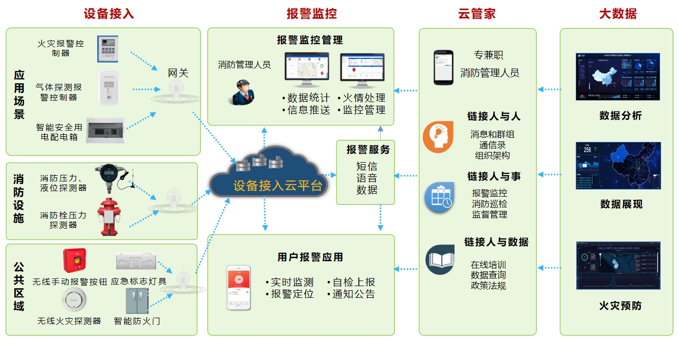 “技防”是在末端有安全隱患的部位安裝傳感器,利用平臺(tái)優(yōu)勢實(shí)時(shí)監(jiān)測管轄內(nèi)所有養(yǎng)老院消防設(shè)備設(shè)施和重要消防部位的運(yùn)行狀態(tài),足不出戶便可輕松掌握單位的建筑消防用水、電氣火災(zāi)隱患、獨(dú)立煙感探測和可燃?xì)怏w報(bào)警等末端實(shí)時(shí)監(jiān)測數(shù)據(jù)。一旦有超預(yù)警值的設(shè)備,平臺(tái)馬上在第一時(shí)間將隱患報(bào)警信息推送給相關(guān)責(zé)任人,實(shí)現(xiàn)了監(jiān)管方向的精準(zhǔn)定位,將火災(zāi)隱患消滅在萌芽之中,真正起到“滅早滅小”的作用。