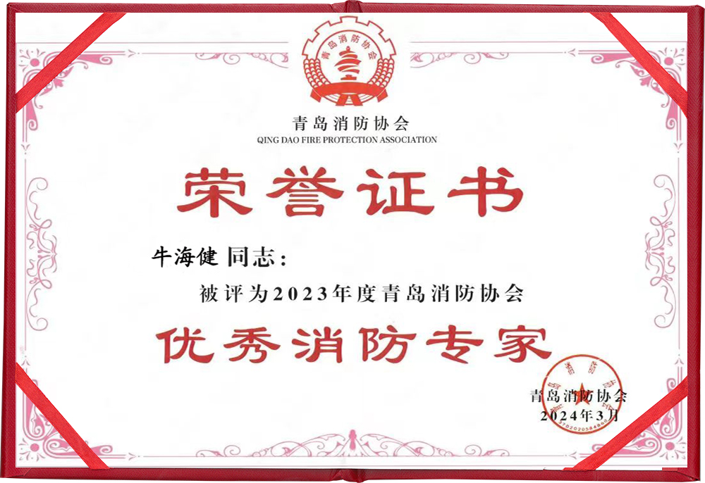 峻海物聯憑借扎實的專業技術和優質的服務,通過協會層層審核,榮獲2023年度青島消防協會“突出貢獻消防企業”和“119消防宣傳活動先進單位”稱號,牛海健被授予“優秀消防專家”榮譽稱號。