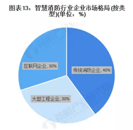 從整體競爭力來看,傳統消防企業進入消防產品市場較早、技術穩定,具有相對固定的客戶群體,但體量較小、產品技術參數相對落后,占有智慧消防市場約40%的市場份額;大型工程安防企業由于具有較強的技術優勢,其產品研發工作強于其他市場參與者,占據了30%的市場份額;互聯網企業依托“互聯網+”戰略,跨行業進入智慧消防平臺系統開發領域。雖然互聯網企業具有先進的管理理念和強大的資金優勢,但由于行業跨度過大,對于市場了解缺乏深度,因此難以開發出適應市場需求的智慧消防平臺產品,占據30%的市場份額。