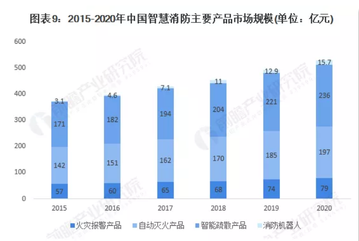 前瞻結合慧聰消防網公布的各消防子細分市場/產品在消防行業中的占比,以及前文測算消防行業市場規模,測算2020年火災報警產品市場規模約為79億元,自動滅火產品市場規模約為197億元,智能疏散產品市場規模約為236億元。綜上,2020年,智慧消防主要產品市場規模達到528億元。