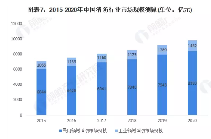 從民用領域來看,根據《建筑設計防火規范GB 50016-2014》規定及其他相關設計規定與行業經驗,在住宅建筑方面消防投入約占建筑總投資的5%,在辦公與商業建筑方面消防投入約占建筑總投資的8%-10%。前瞻結合我國房地產開發住宅投資額、房地產開發辦公樓投資額、房地產開發商業營業用房投資額,按照住宅5%、辦公樓和商業營業用房8%的消防投入占比保守估算,2020年中國民用領域消防市場規模約為8383億元。