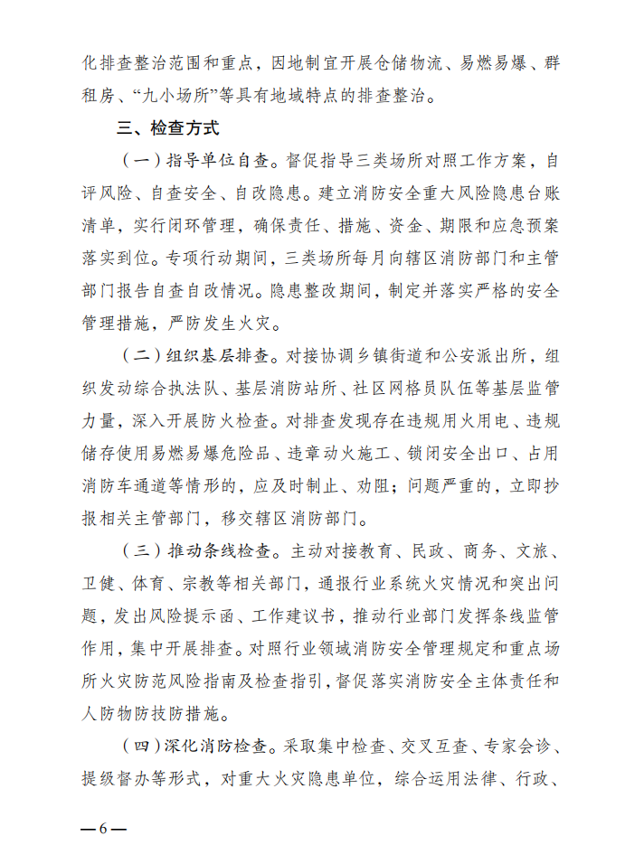 《方案》明確了排查整治的重點場所、突出問題、檢查方式和整改措施。此次排查整治將針對具有較大火災風險、人員活動集中容易造成群死群傷或重大社會影響的人員密集場所、敏感特殊場所、混合生產經營場所。聚焦致災要素,按照火災發生發展的規律,把火源管理、電源管理、易燃可燃保溫材料和裝飾裝修、安全疏散條件、防火分隔、消防設施設備、管理責任落實、初期火災處置等作為排查整治的重點。要求各地深刻吸取近年來典型火災事故教訓,舉一反三,結合轄區實際開展風險研判,對照排查整治重點進行篩查,找出本地容易發生群死群傷和有影響火災的最不放心單位場所,進一步細化排查整治范圍和重點,因地制宜開展倉儲物流、易燃易爆、群租房、“九小場所”等具有地域特點的排查整治。要求各地通過指導單位自查、組織基層排查、推動條線檢查、深化消防檢查的方式,采取集中力量整治、提請政府整治、輿論監督整治、信用監管整治等措施全面整治、強力除患。