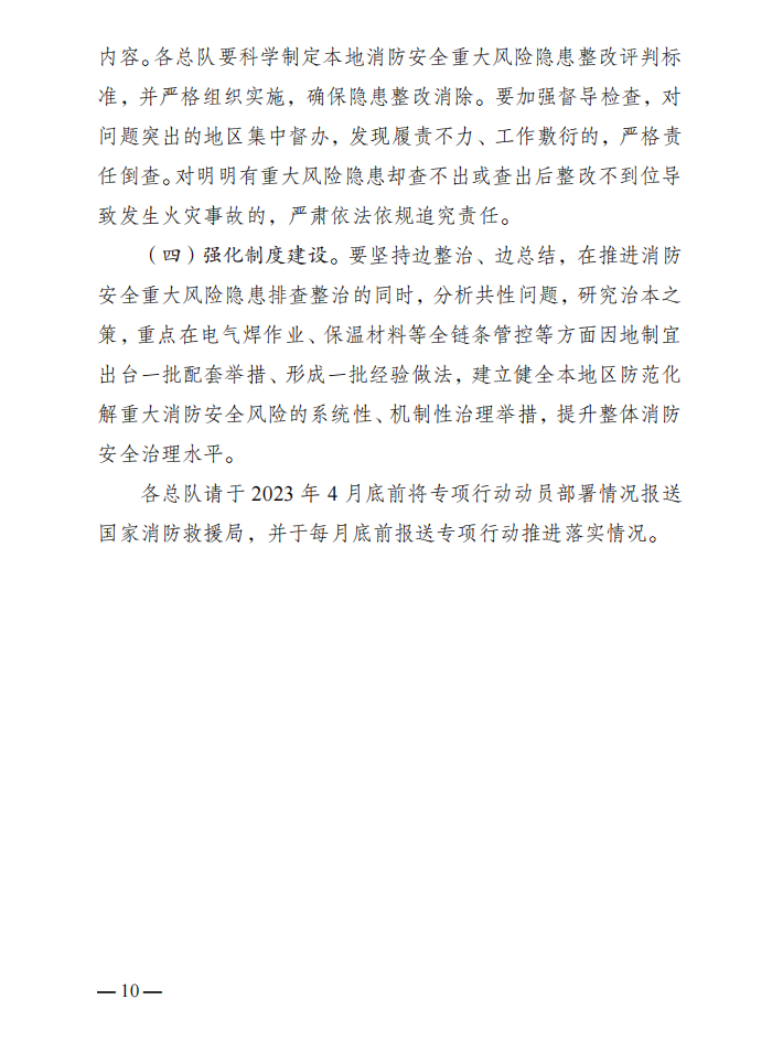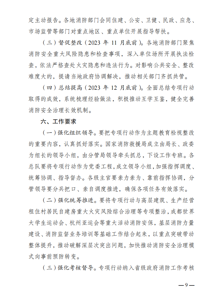 《方案》要求,各地要強化組織領導,把專項行動作為主題教育檢視整改的重要內容,認真抓好落實。要強化統籌推進,以重點突破帶動整體提升,推動破解深層次突出問題,加快推動消防安全治理模式向事前預防轉變。要強化考核督導,將專項行動納入省級政府消防工作考核內容。要強化制度建設,堅持邊整治、邊總結,在推進消防安全重大風險隱患排查整治的同時,分析共性問題,研究治本之策,重點在電氣焊作業、保溫材料等全鏈條管控等方面因地制宜出臺一批配套舉措、形成一批經驗做法,建立健全本地區防范化解重大消防安全風險的系統性、機制性治理舉措,提升整體消防安全治理水平。